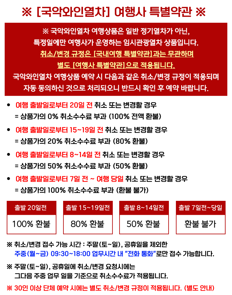 ※최소인원(150名) 미달시 행사가 취소 또는 일반열차로 진행 될 수 있습니다. ※ 2일전까지 모객이 되지 않아 취소시에는 쌍방원칙에 따라 배상의 책임을 지지 않음을 알려 드립니다. |